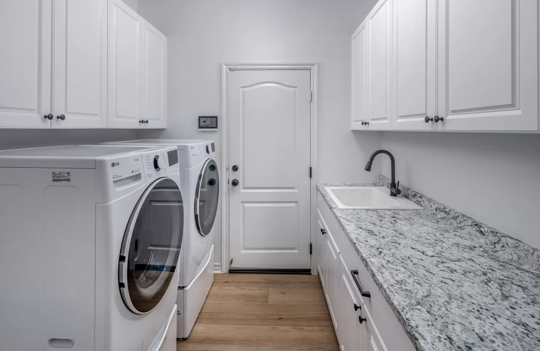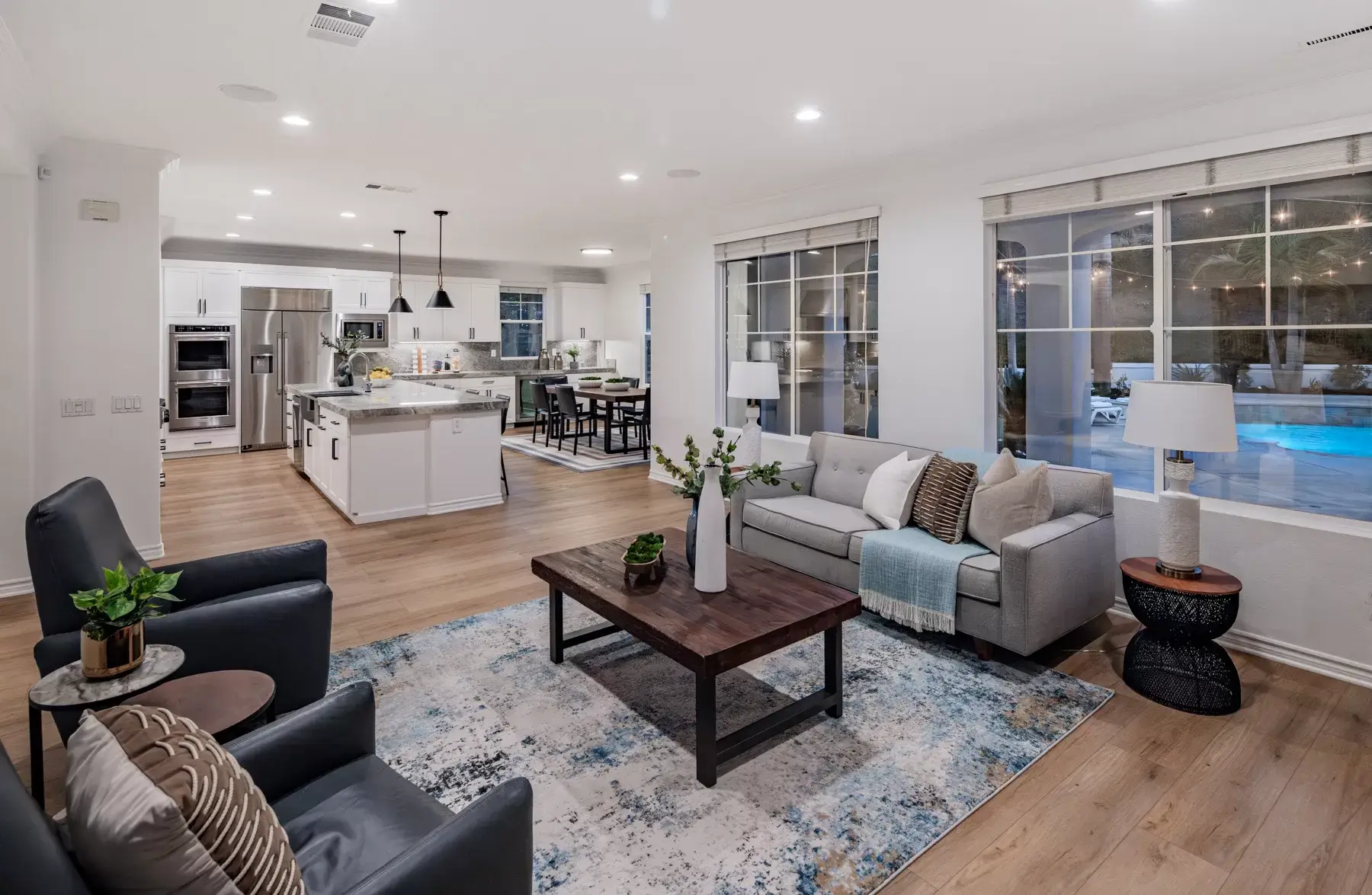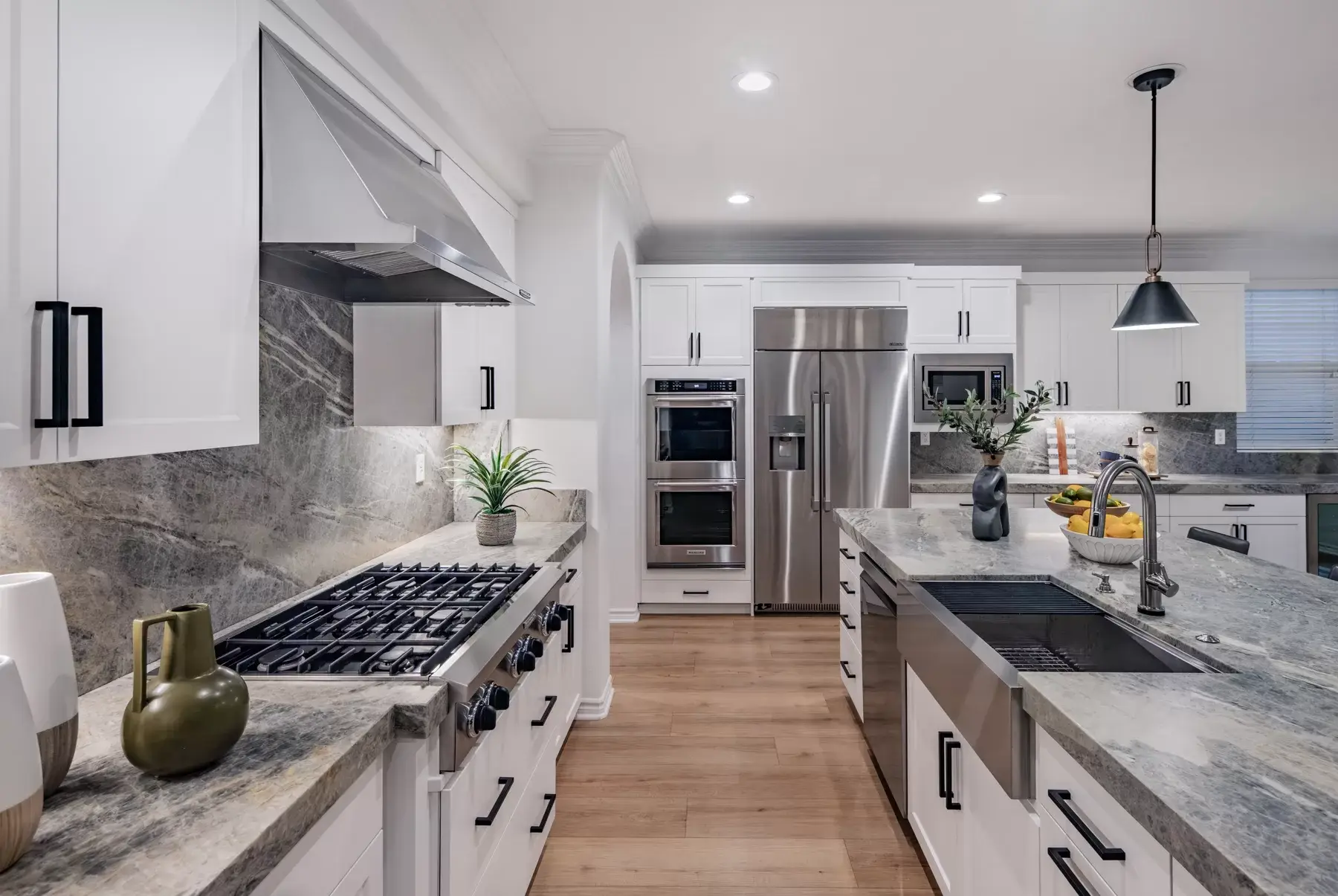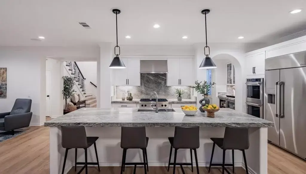 The recently remodeled kitchen is the centerpiece of the home, featuring quartzite countertops and matching backsplash, updated cabinetry, a large center island, and premium appliances including a Dacor refrigerator and six-burner gas cooktop. A butler’s pantry, walk-in pantry, and wine closet add exceptional storage and function. Gas fireplaces in both the living room and family room create warm, inviting gathering spaces.