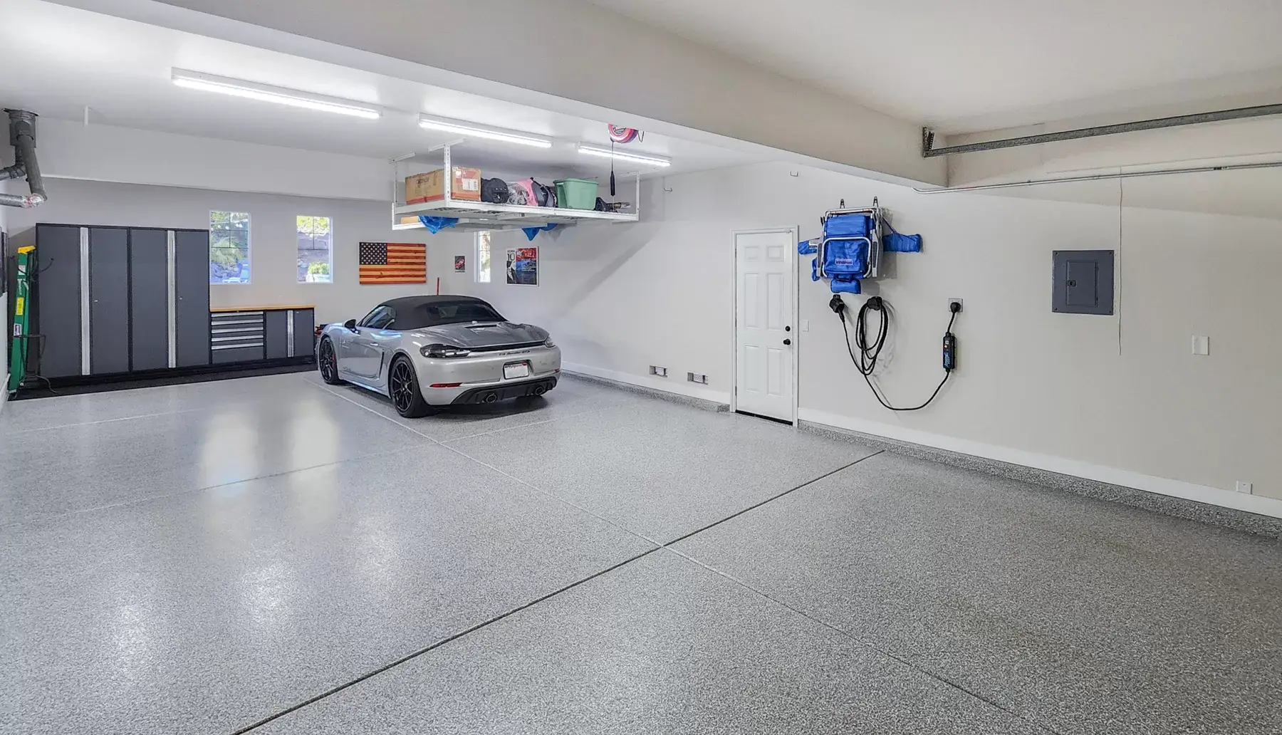The layout offers four generously sized bedrooms and four-and-a-half bathrooms, plus an upstairs loft and a flexible downstairs den or office. The four-car garage features epoxy flooring, an EV charger, and custom cabinetry.